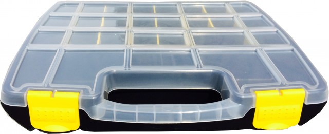 Органайзеры с регулируемыми размерами ячеек - это удобная и практичная емкость для хранения. Исполненный в виде чемоданчика и разделенный внутри на небольшие секции. Оптимален для хранения различных деталей, крепежа и других мелочей. Может использоваться в мастерских, в быту, в гараже или на даче.Преимущества:- плотно закрывающаяся крышка с фиксаторами предотвращает утерю деталей;- изготовлен из полипропилена, устойчивого к механическим воздействиям;- возможность менять размер секций с помощью съемных вставок ( в комплекте). Корпус органайзера выполнен в черном цвете, крышка прозрачная, вставки и замки желтого цвета.